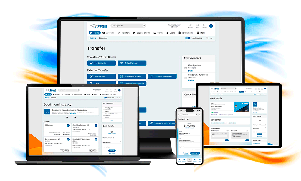 Diamond is thrilled to introduce a new digital banking platform – designed to give you more control, increased flexibility, and an easy way to manage all your Diamond accounts and services. This will not be an upgrade; it is a completely new digital banking platform. Members using the mobile banking app will need to download the new app on November 4. Members using desktop can login to the new platform through online banking on our website.